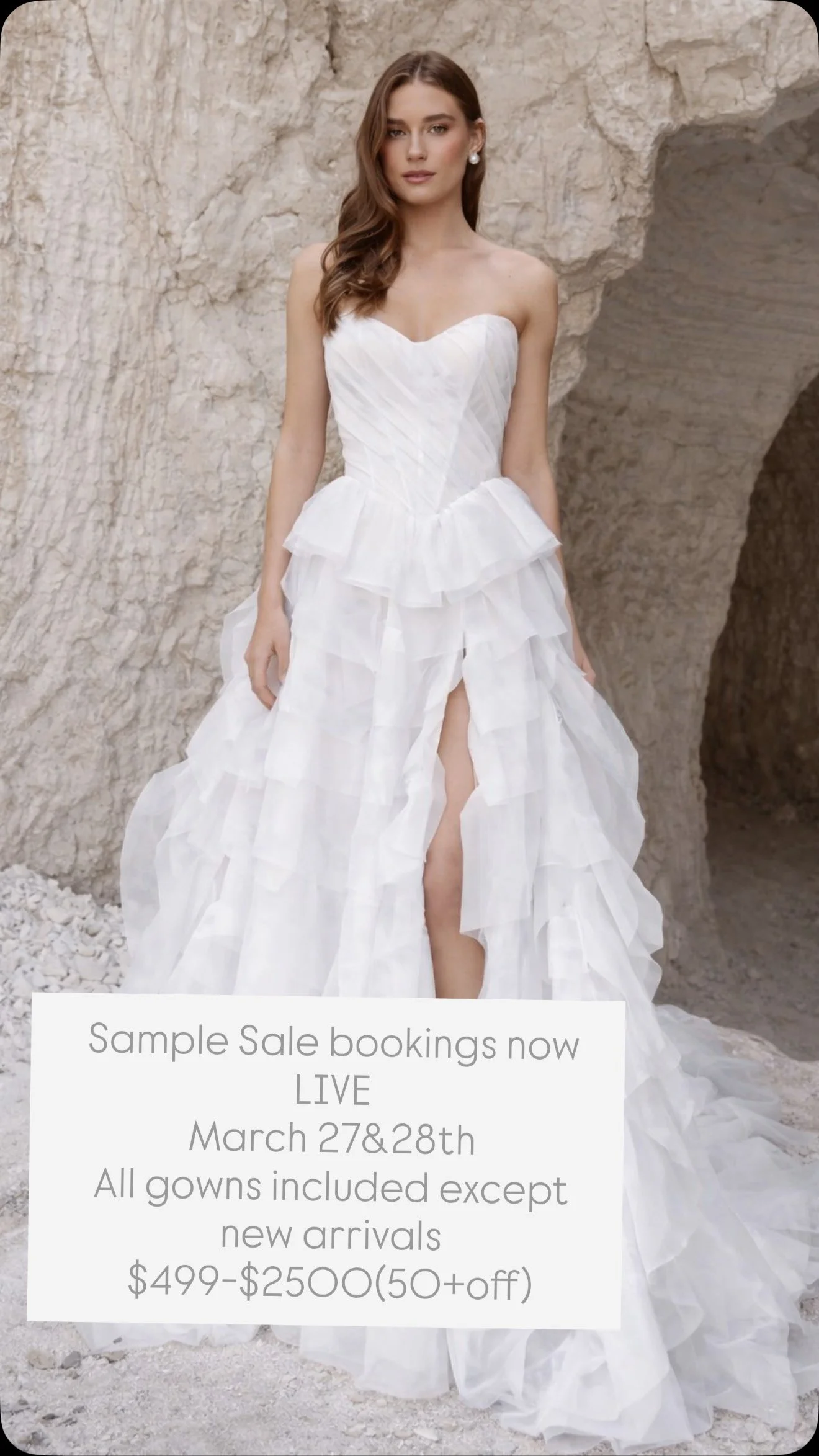 Every gown except for new arrivals will be up for grabs! All samples will be priced $500 off or up to 50% off. Samples will be mostly bridal size 14 (street size 8-12) with some bridal size 20-28 (street size 18-26). Please note- sample sale appointments are 45 minutes, two guests maximum. Decisions happen fast in sample sale appointments, which is why it is not recommended for first appointments- be ready to say YES and take a gown home with you today! These are perfect for the bride hoping to get a deal or a bride with a wedding happening soon!